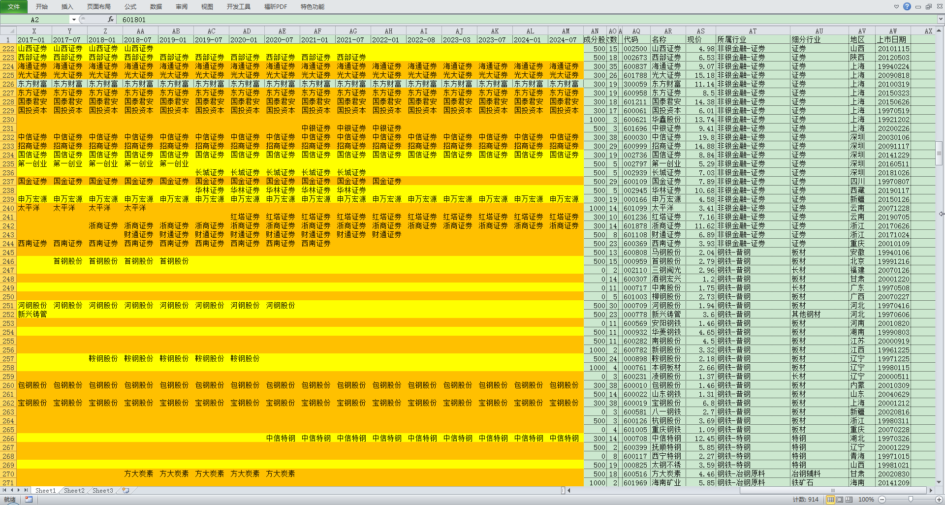 个股按照代码大小排序,分别是深市主板、创业板、沪市主板、科创板,显示在A列,共914只;第一行的则是时间段,每年两次指数变动,共38列。