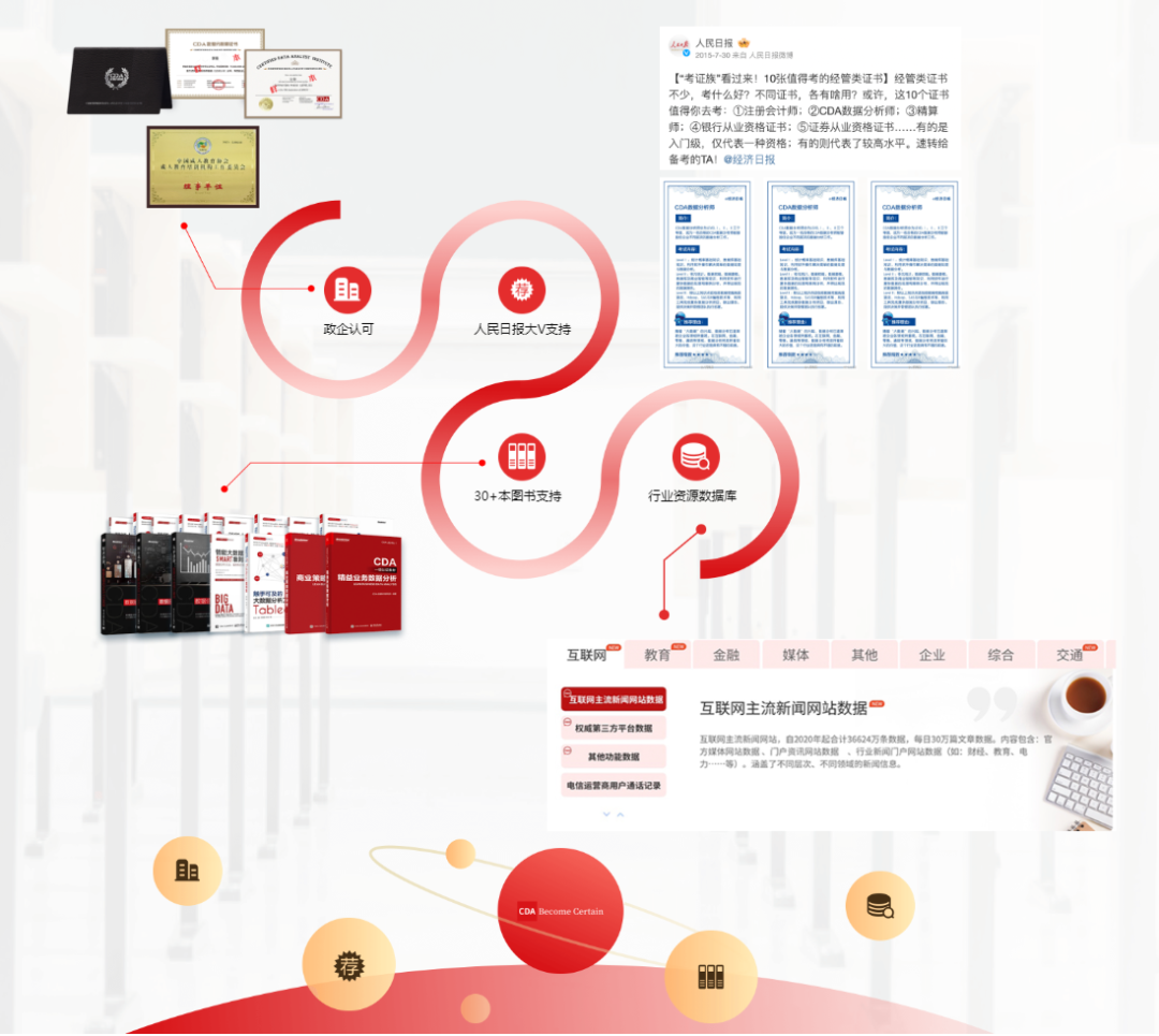 CDA认证已举办12年,获政府、企业广泛认可,出版30余本丛书,构建跨行业数据资源库,成功举办六届行业峰会,会员数十万。