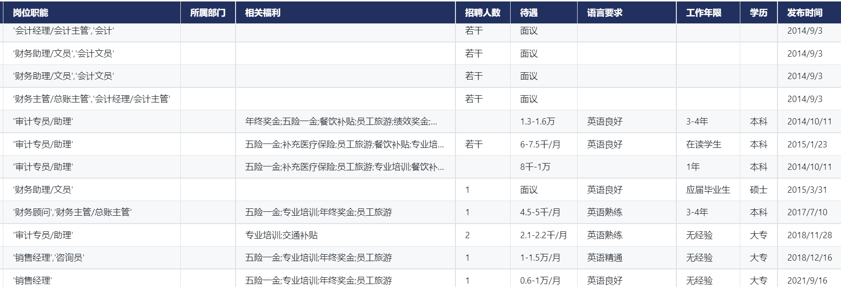 的招聘信息,得到了会计师事务所线上招聘数据,涵盖公司名称、所在区域、岗位、招聘人数、待遇、语言要求、工作年限、学历、发布时间等字段内容。