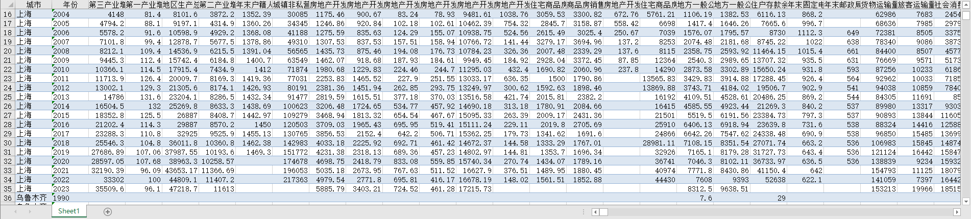数据来源于国家统计局,指标包含:城市、年份、第三产业增加值、第一产业增加值 地区生产总值、第二产业增加值、年末户籍人口、城镇非私营单位在岗职工平均工资 房地产开发投资额、