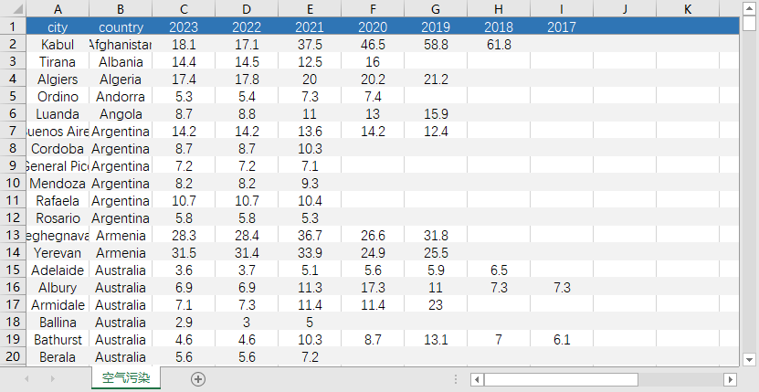 世界各国城市空气质量数据空气污染指标PM2.5浓度17-23年数据有缺失