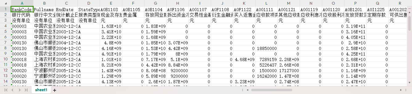 银行代码 银行中文全称 统计截止日期 报表类型编码 现金及存放中央银行款项 贵金属 存放同业款项 拆出资金净额 交易性金融资产 衍生金融资产 买入返售金融资产净额 应收款项类投资 其他应收款净额 应收利息净额 应收股利净额 发放贷款及垫款净额 定期存款 可供出售金融资产净额 持有至到期投资净额 长期股权投资净额 投资性房地产净额 固定资产净额 在建工程净额 固定资产清理 无形资产净额 商誉净额 长期待摊费用 递延所得税资产 其他资产 资产总计 向中央银行借款 拆入资金 吸收存款及同业存放 其中:同业及其他金融机构存放款项 其中:吸收存款 短期借款 交易性金融负债 衍生金融负债 卖出回购金融资产款 应付职工薪酬 应交税费 应付利息 应付股利 其他应付款 长期借款 应付债券 预计负债 递延所得税负债 其他负债 负债合计 实收资本(或股本) 资本公积 减:库存股 盈余公积 未分配利润 外币报表折算差额 未确认的投资损失 一般风险准备 归属于母公司所有者权益合计 少数股东权益 所有者权益合计 负债与所有者权益总计