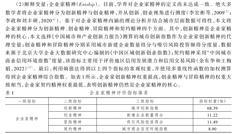 本文将企业家精神分为创新精神、创业精神、冒险精神和契约精神四个方面。其中,创新精神是企业家精神的核心,本文选择《中国城市和产业创新力报告》测算的城市创新指数作为企业家创新精神的代理变量;创业精神和冒险精神分别采用城市新建企业数量得分与吸引风险投资额得分度量,数据来源于北京大学企业大数据研究中心编制的《中国区域创新创业指数》;契约精神采用“中国城市商业信用环境指数”度量。最后,利用熵值法得到以上四个指标的客观权重,并使用多重线性函数的加权测算得到企业家精神综合指数。