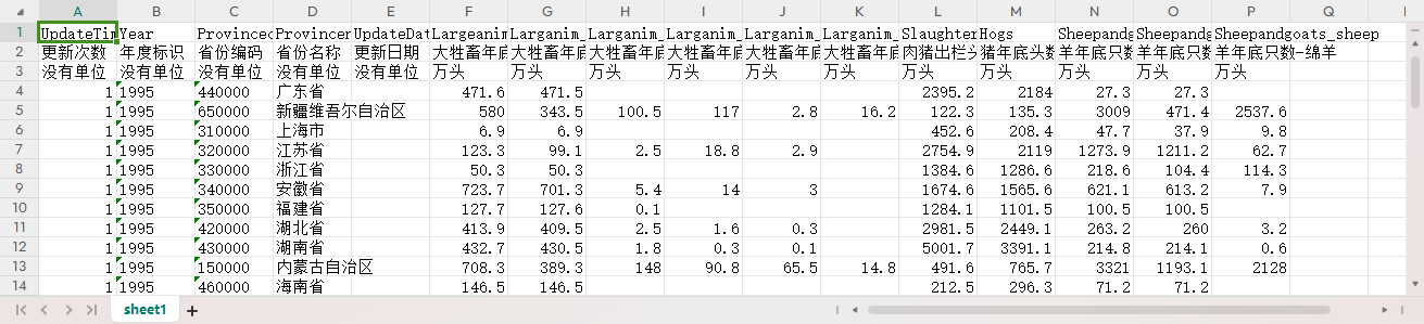 更新次数        年度标识        省份编码        省份名称        更新日期        大牲畜年底头数总计        大牲畜年底头数-牛        大牲畜年底头数-马        大牲畜年底头数-驴        大牲畜年底头数-骡        大牲畜年底头数-骆驼        肉猪出栏头数        猪年底头数        羊年底只数        羊年底只数-山羊        羊年底只数-绵羊