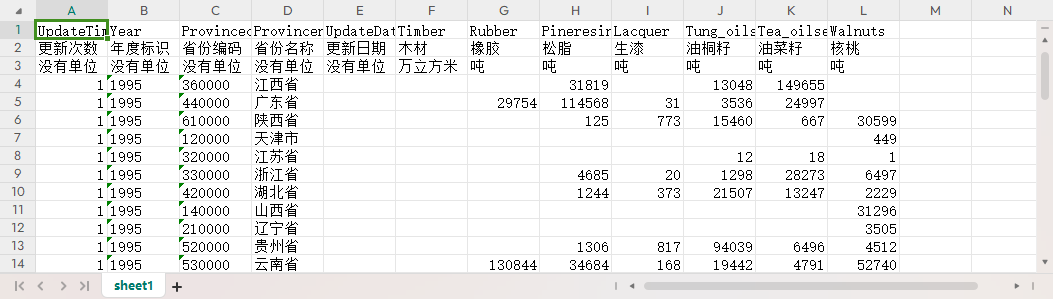 更新次数 年度标识 省份编码 省份名称 更新日期 木材 橡胶 松脂 生漆 油桐籽 油菜籽 核桃