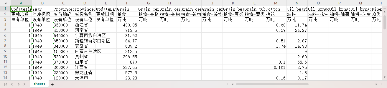 更新次数 年度标识 省份编码 省份名称 更新日期 粮食 粮食-谷物 粮食-谷物-稻谷 粮食-谷物-小麦 粮食-谷物-玉米 粮食-豆类 粮食-薯类 棉花 油料 油料-花生 油料-油菜籽 油料-芝麻 麻类 麻类-黄红麻 甘蔗 甜菜 烟叶 烟叶-烤烟 蚕茧 蚕茧-桑蚕茧 茶叶 水果 水果-苹果 水果-柑桔 水果-梨 水果-葡萄 水果-香蕉