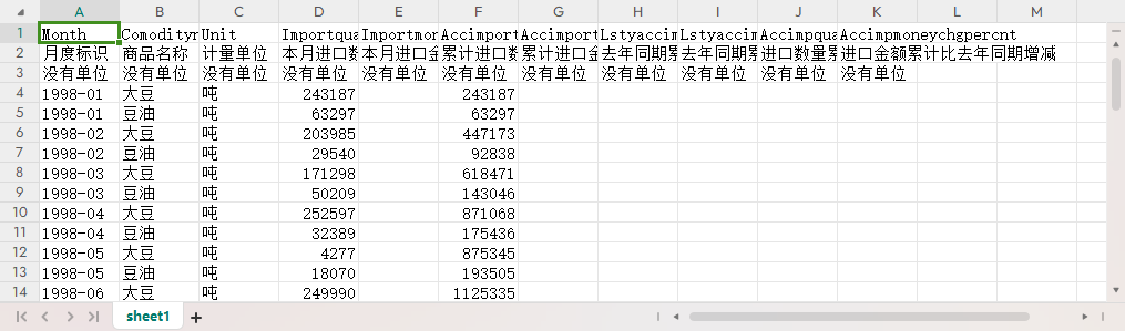 月度标识 商品名称 计量单位 本月进口数量 本月进口金额 累计进口数量 累计进口金额 去年同期累计进口数量 去年同期累计进口金额 进口数量累计比去年同期增减 进口金额累计比去年同期增减