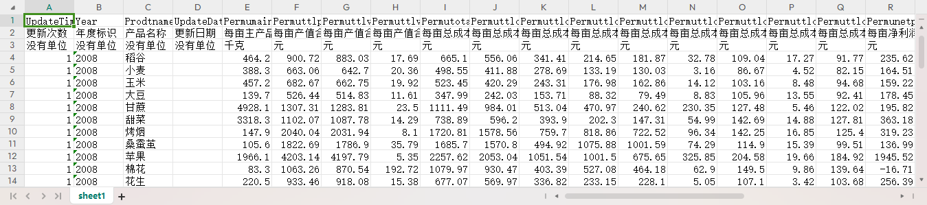 更新次数 年度标识 产品名称 更新日期 每亩主产品产量 每亩产值合计 每亩产值合计--主产品产值 每亩产值合计-副产品产值 每亩总成本 每亩总成本-生产成本 每亩总成本-生产成本-物质与服务费用 每亩总成本-生产成本-人工成本 每亩总成本-生产成本-人工成本-家庭用工折价 每亩总成本-生产成本-人工成本-雇工费用 每亩总成本-土地成本 每亩总成本-土地成本-流转地租金 每亩总成本-土地成本-自营地折租 每亩净利润 每亩现金成本 每亩现金收益 每亩成本利润率 每50公斤主产品平均出售价格 每50公斤主产品总成本 每50公斤主产品总成本-生产成本 每50公斤主产品净利润 每50公斤主产品现金成本 每50公斤主产品现金收益 每亩用工数量 每亩主产品出售数量 每亩主产品出售产值 商品率 每亩成本外支出