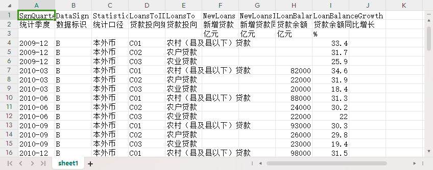 统计季度 数据标识 统计口径 贷款投向编码 贷款投向 新增贷款 新增贷款同比增减 贷款余额 贷款余额同比增长