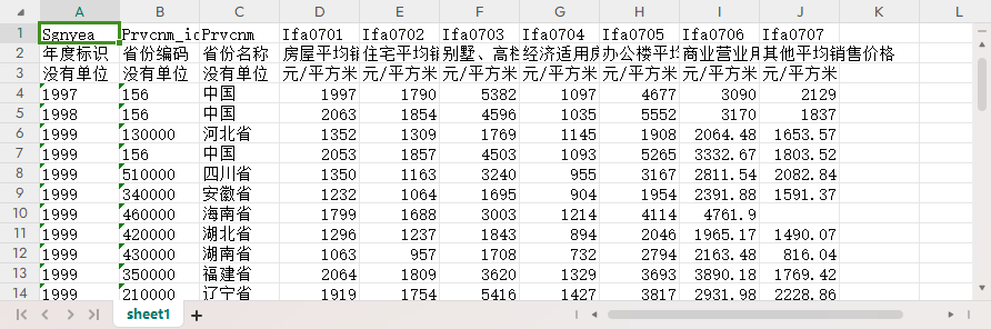 年度标识 省份编码 省份名称 房屋平均销售价格 住宅平均销售价格 别墅、高档公寓平均销售价格 经济适用房平均销售价格 办公楼平均销售价格 商业营业用房平均销售价格 其他平均销售价格