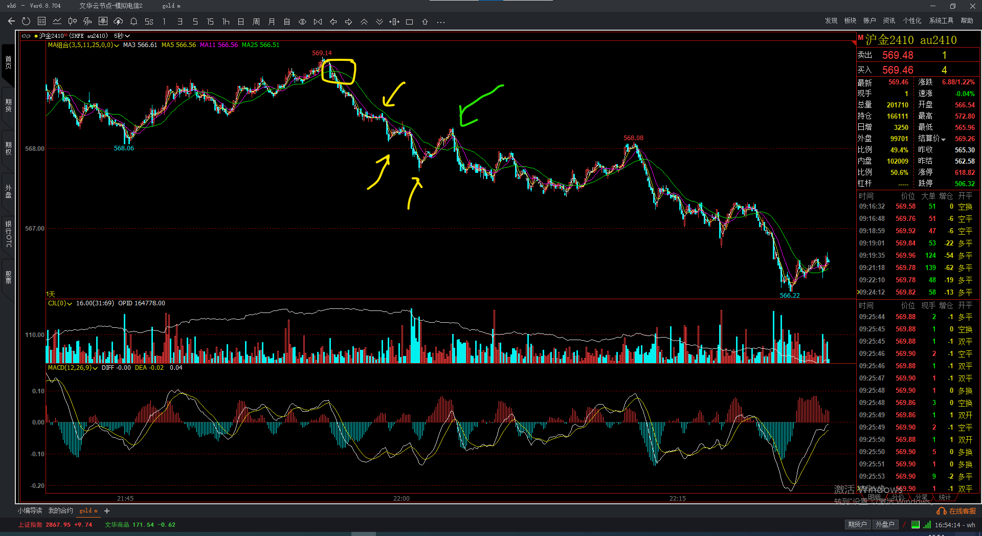 5、绿色下箭头,就是再进场点。理由,前面两处密集区的压制,神算很大,ma11的入场信号,还有黄箭头到绿箭头这笔内部的微细结构。