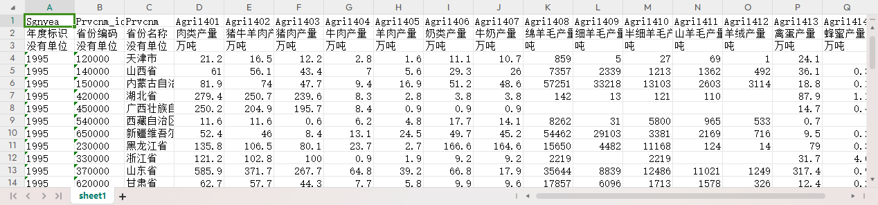 年度标识 省份编码 省份名称 肉类产量 猪牛羊肉产量 猪肉产量 牛肉产量 羊肉产量 奶类产量 牛奶产量 绵羊毛产量 细羊毛产量 半细羊毛产量 山羊毛产量 羊绒产量 禽蛋产量 蜂蜜产量