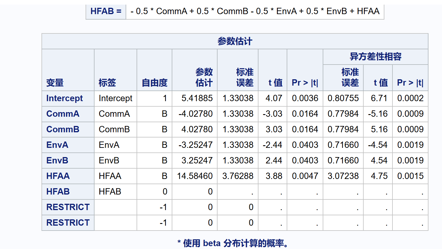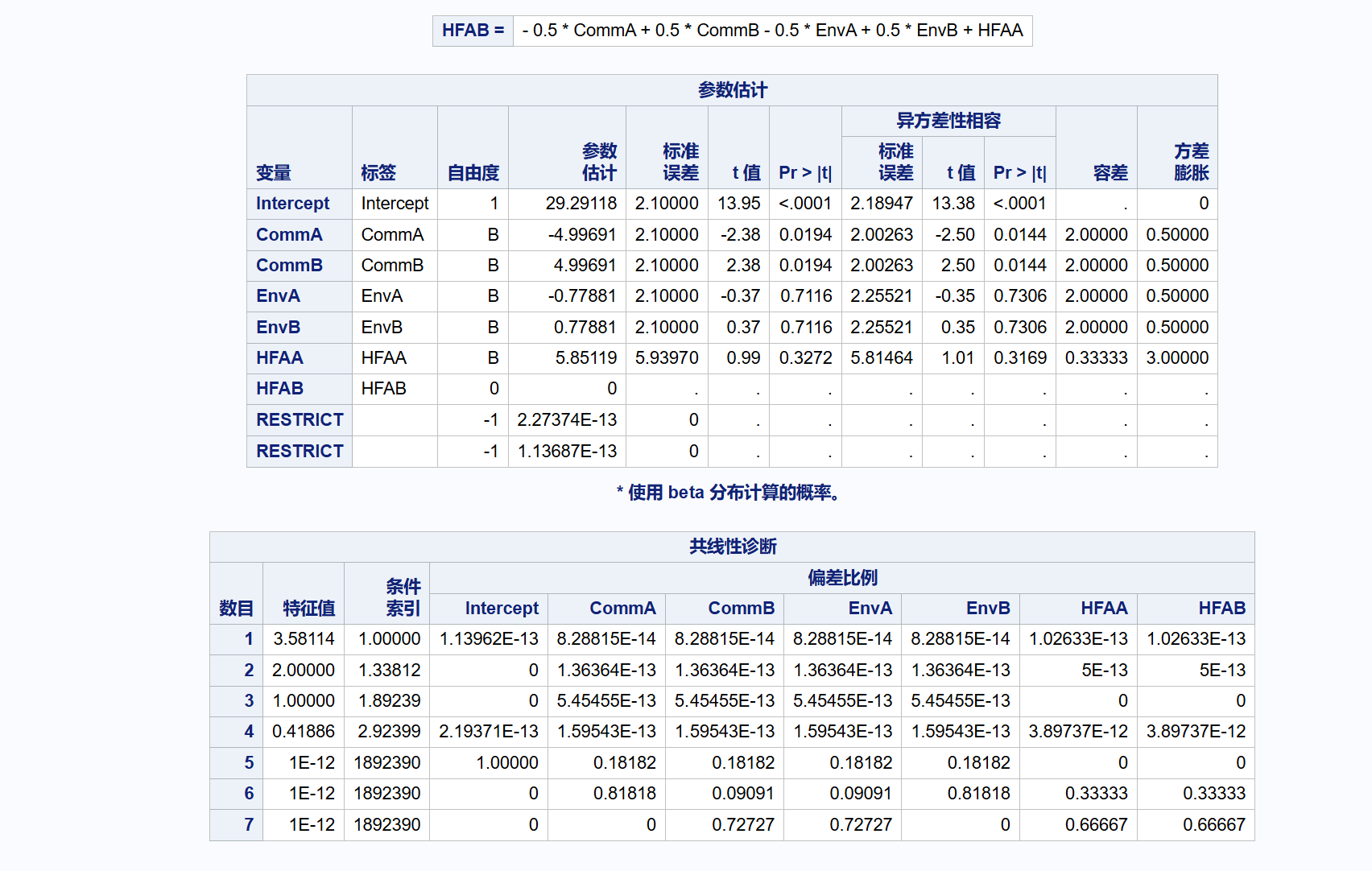 在这个版本中,`Comm` 和 `Env` 分别对应你的`CommA`, `CommB` 和 `EnvA`, `EnvB`。通过使用`class`语句和`param=glm`选项,SAS将自动为这些分类变量创建虚拟变量,并采用GLM编码(默认),这通常会避免列秩不足的问题。