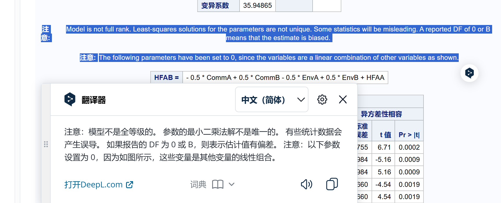 但是,警告信息仍然提示“Model is not full rank”,这可能意味着以下几种情况之一: