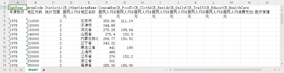 年度标识 地区代码 统计范围 居民人均消费支出-其他用品及服务 地区名称 居民人均消费支出 居民人均消费支出-食品烟酒 居民人均消费支出-衣着 居民人均消费支出-居住 居民人均消费支出-生活用品及服务 居民人均消费支出-交通通信 居民人均消费支出-教育文化娱乐 居民人均消费支出-医疗保健