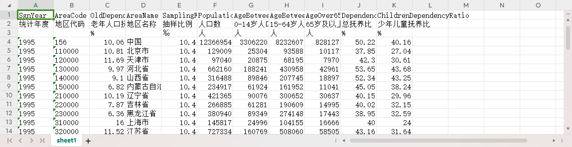 统计年度 地区代码 老年人口抚养比 地区名称 抽样比例 人口数 0-14岁人口数 15-64岁人口数 65岁及以上人口数 总抚养比 少年儿童抚养比