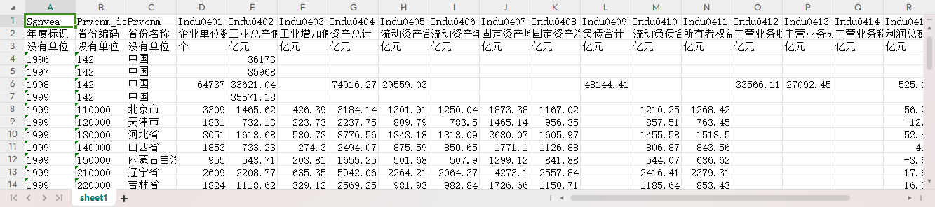 年度标识 省份编码 省份名称 企业单位数 工业总产值 工业增加值 资产总计 流动资产合计 流动资产年平均余额 固定资产原价 固定资产净值年平均余额 负债合计 流动负债合计 所有者权益合计 主营业务收入 主营业务成本 主营业务税金及附加 利润总额 本年应交增值税 全部从业人员年平均人数