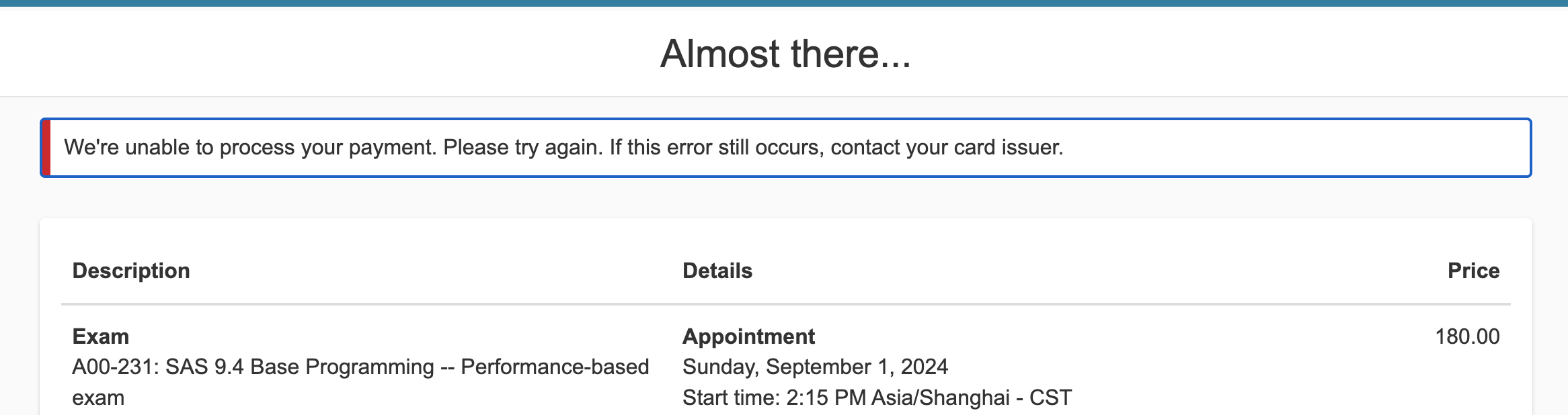 SAS如何报名,卡在行用卡付钱这一步?如图。这是行用卡的问题吗