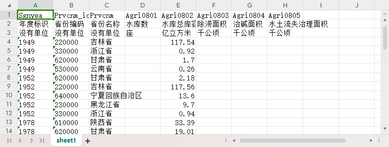 年度标识 省份编码 省份名称 水库数 水库总库容量 除涝面积 治碱面积 水土流失治理面积