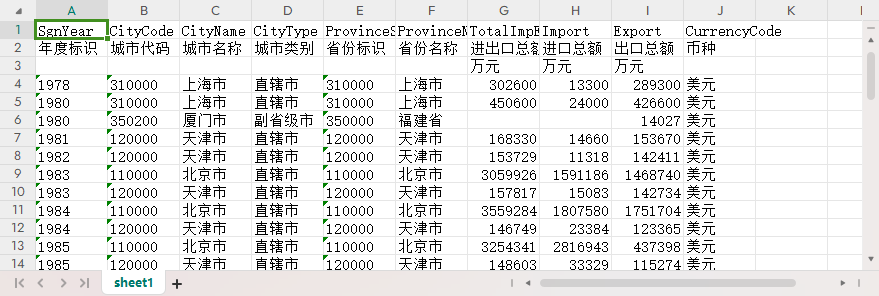 年度标识 城市代码 城市名称 城市类别 省份标识 省份名称 进出口总额 进口总额 出口总额 币种