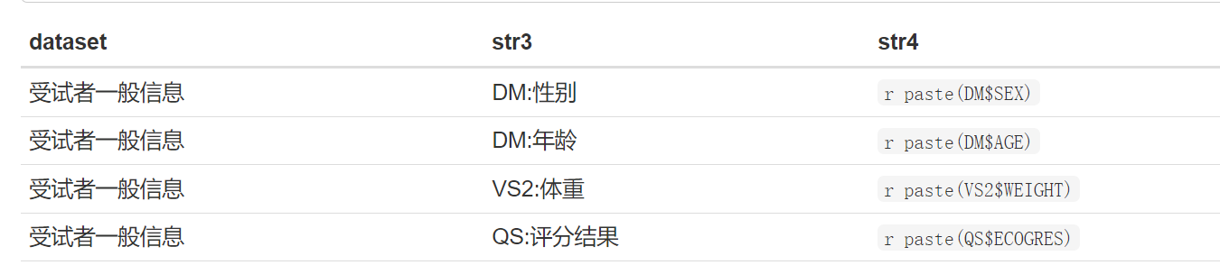 我想用rmarkdown输出一个表格,目前把数据整理成了这样子,然后我想让他输出的时候把str4列的内容转换成实际的变量值,比如性别对应男或女,想问一下大家应该怎么做呢