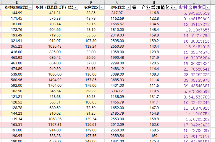 4、数据指标:农林牧渔业贷款、农村(县及县以下)贷款、农户贷款、涉农贷款、第一产业增加值亿元、农村金融发展。