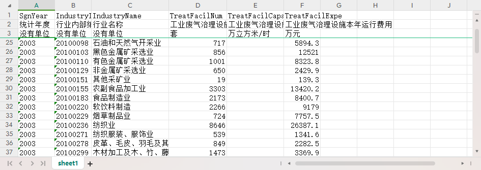 统计年度 行业内部编码 行业名称 工业废气治理设施数 工业废气治理设施处理能力 工业废气治理设施本年运行费用