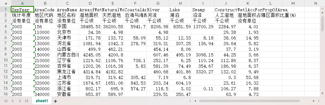 统计年度 地区代码 地区名称 湿地面积 天然湿地 近海与海岸 河流 湖泊 沼泽 人工湿地 湿地面积占辖区面积比重(%)