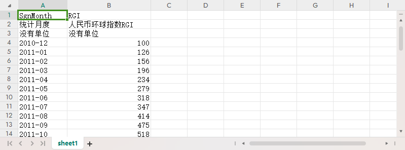 人民币国际化人民币环球指数表(月)2010-2023人民币环球指数RGI