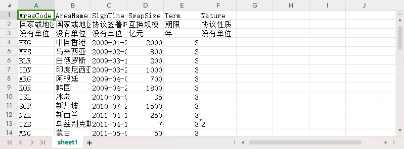 国家或地区代码 国家或地区名称 协议签署时间 互换规模 期限 协议性质