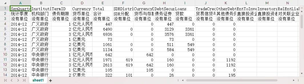 统计季度 机构部门 债务期限 货币单位 合计 SDR分配 货币与存款 债务证券 贷款 贸易信贷与预付款 其他债务负债 直接投资企业对直接投资者的债务负债 直接投资者对直接投资企业的债务负债 对关联企业的债务负债