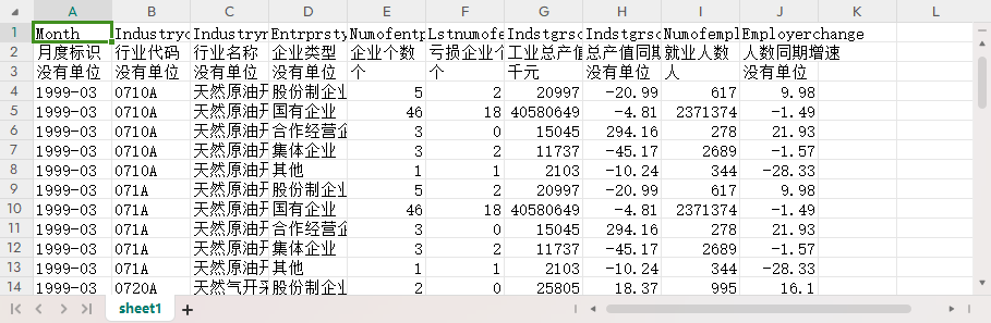 月度标识 行业代码 行业名称 企业类型 企业个数 亏损企业个数 工业总产值 总产值同期增速 就业人数 人数同期增速