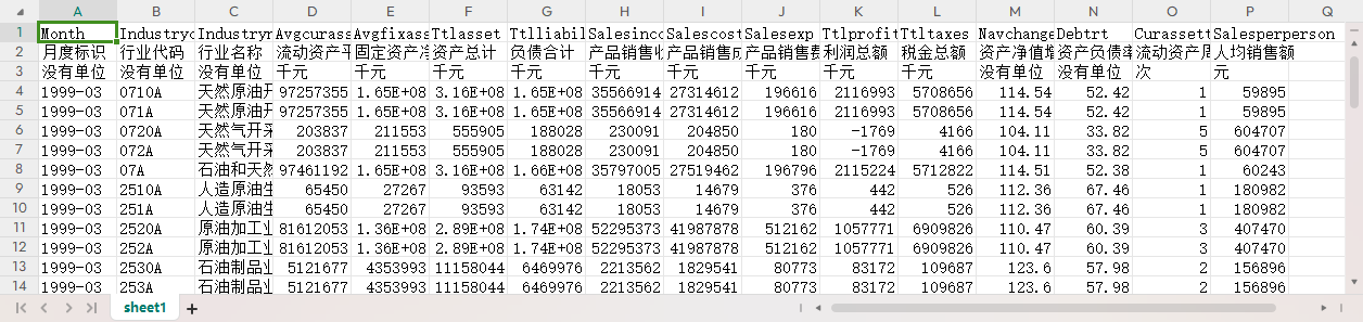 月度标识 行业代码 行业名称 流动资产平均余额 固定资产净值平均余额 资产总计 负债合计 产品销售收入 产品销售成本 产品销售费用 利润总额 税金总额 资产净值增长率 资产负债率 流动资产周转速度 人均销售额