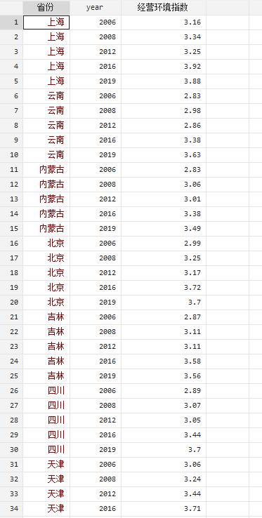 初始数据来源于《中国分省企业经营环境指数2020年报告》——企业经营环境总体进展和分省排序,由于该报告部分年份数据缺失,仅有2006年、2008 年、2010年、2012年、2016 年和2019年的数据。囿于数据可得性且每年变动相对稳定,故采用线性插值法对缺失年份数据进行补充。