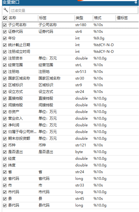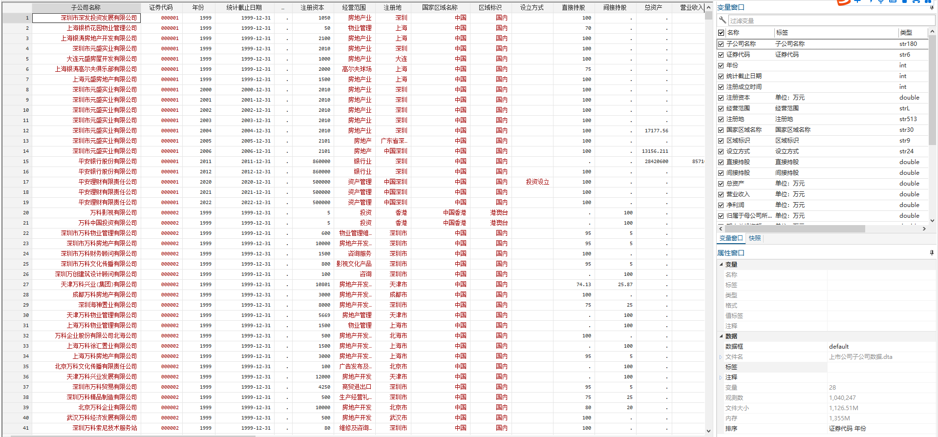 最终处理得到了 1999~2022 年上市公司子公司经纬度及其所处的省市区县信息,一共包含 104 万条(原数据是 108万条,剔除重复之后就是这个数量了)结果,数据概览如下: