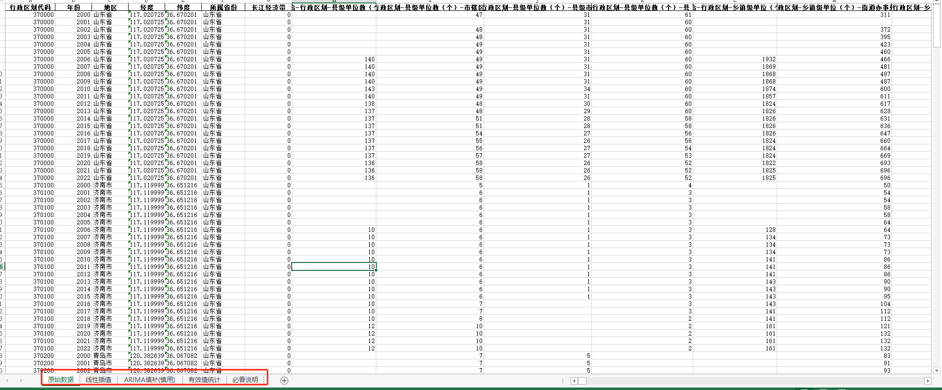 山东省面板统计数据库(包含四个页签:原始数据、线性插值、ARIMA填补、有效统计值四个页签),整理了山东省统计年鉴2001-2023年,数据年度2000-2022年,包含省级数据,及山东省17个城市数据。