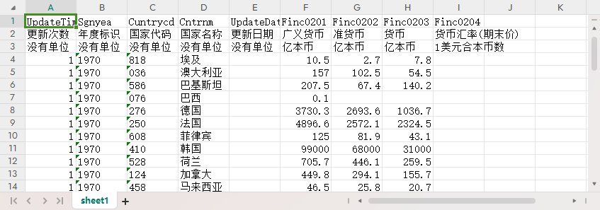 更新次数 年度标识 国家代码 国家名称 更新日期 广义货币 准货币 货币 货币汇率(期末价)