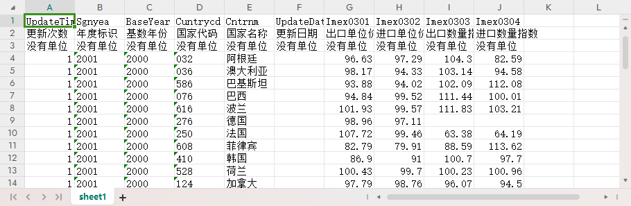 更新次数 年度标识 基数年份 国家代码 国家名称 更新日期 出口单位价值指数 进口单位价值指数 出口数量指数 进口数量指数
