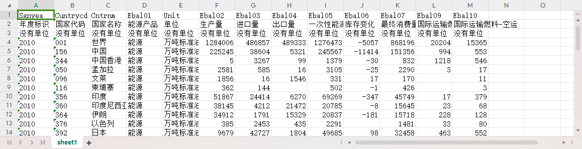 年度标识 国家代码 国家名称 能源产品 单位 生产量 进口量 出口量 一次性能源供应量 库存变化 最终消费量 国际运输燃料-海运 国际运输燃料-空运