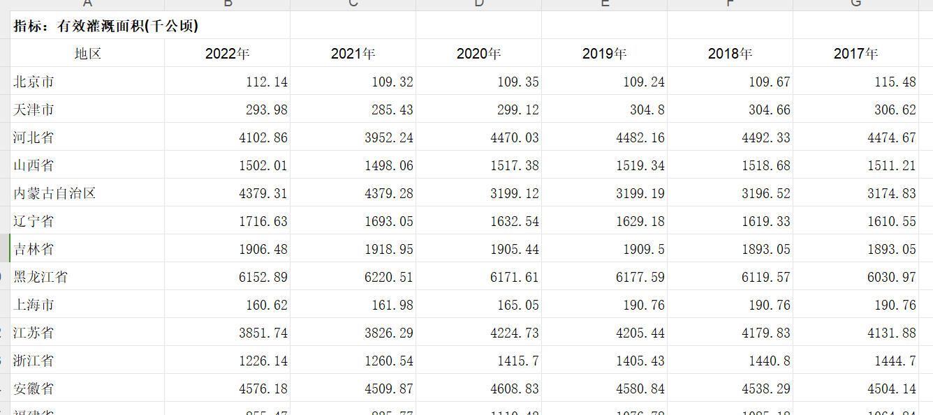 1997-2022年各省有效灌溉面积数据(无缺失)