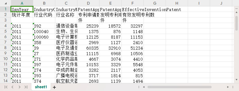 统计年度 行业代码 行业名称 专利申请数 发明专利申请数 有效发明专利数