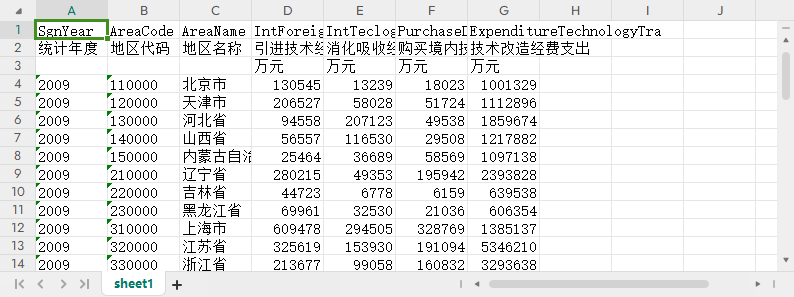 统计年度 地区代码 地区名称 引进技术经费支出 消化吸收经费支出 购买境内技术经费支出 技术改造经费支出