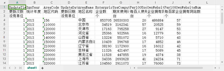 更新次数 统计年度 地区代码 更新日期 地区名称 企业数 期末使用计算机数 每百人使用计算机数 企业拥有网站数 每百家企业拥有网站数