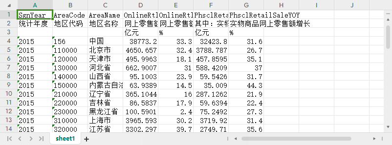 统计年度 地区代码 地区名称 网上零售额 网上零售额增长 其中:实物商品网上零售额 实物商品网上零售额增长