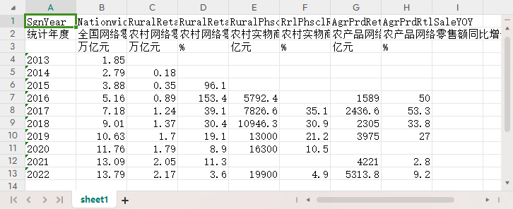 统计年度        全国网络零售额        农村网络零售额        农村网络零售额同比增长        农村实物商品网络零售额        农村实物商品网络零售额同比增长        农产品网络零售额        农产品网络零售额同比增长