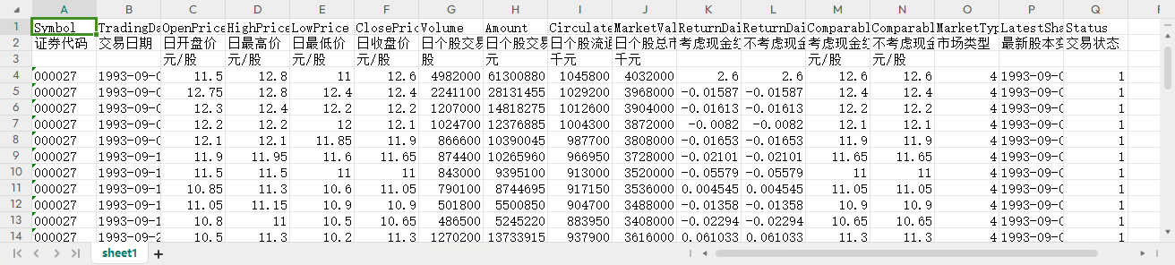 证券代码 交易日期 日开盘价 日最高价 日最低价 日收盘价 日个股交易股数 日个股交易金额 日个股流通市值 日个股总市值 考虑现金红利再投资的日个股回报率 不考虑现金红利的日个股回报率 考虑现金红利再投资的收盘价的可比价格 不考虑现金红利的收盘价的可比价格 市场类型 最新股本变动日期 交易状态
