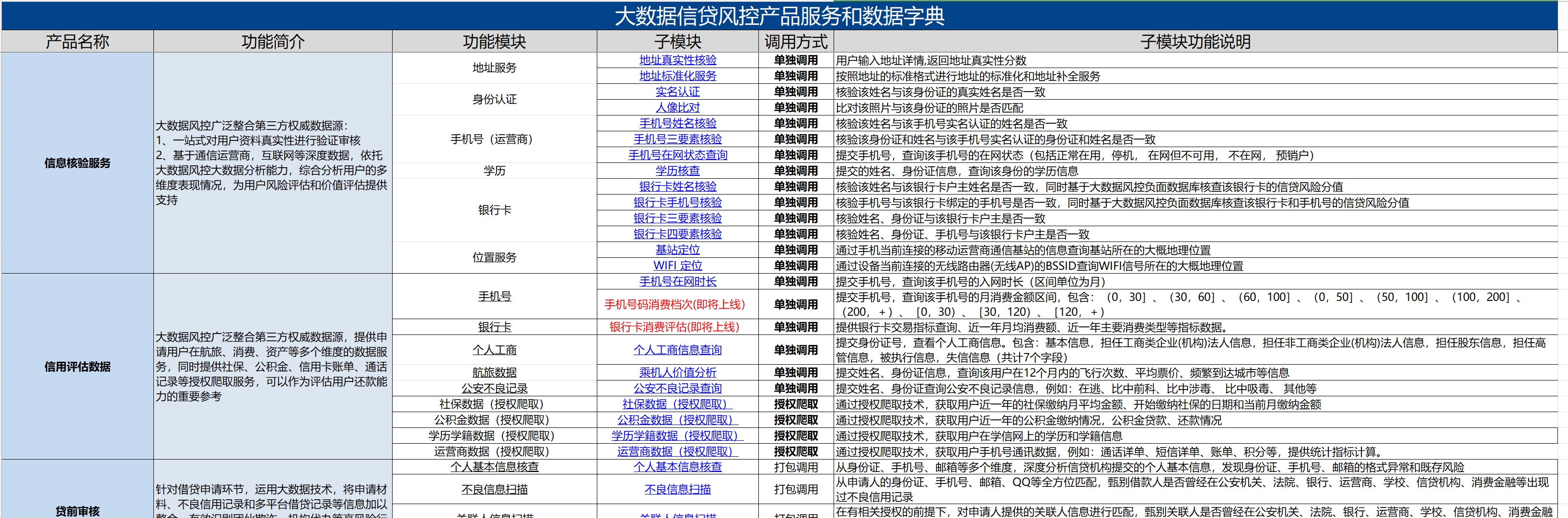 金融的本质是风控,在当前不动产贷款大幅萎缩下,to C的消费贷款越来越成为业务发展的重点,但是业务面临着不断恶化的经济环境,使得信贷违约风险不断积累,商业银行及各种贷款机构迫切地在寻找外部专业供应商, 来支撑金融机构的信贷风险管理。数据是支撑金融风控的关键生产要素,但是传统的银行机构,受监管合规的严格规范,导致在大数据风控领域并不具有优势,因此给了外部大数据风控服务供应商业务发展的机会。笔者跟随国内几家头部金融风控数据服务供应商为不下十家金融机构进行大数据风控服务体系建设,逐渐形成一套大数据风控服务数据产品,围绕信贷业务贷前、贷中和贷后各环节提供身份验真、反欺诈、信用评分等几十项数据服务。本材料包括了这些数据服务的数据要素和服务设计信息,帮助行业用户快速搭建金融风控数据服务体系。