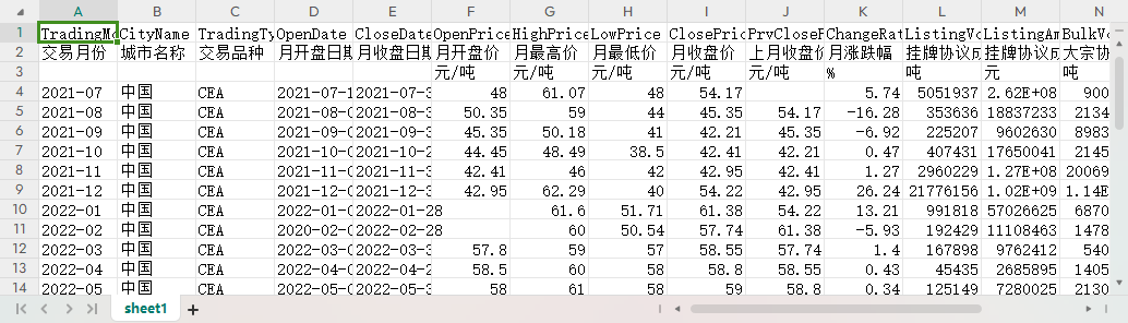 交易月份 城市名称 交易品种 月开盘日期 月收盘日期 月开盘价 月最高价 月最低价 月收盘价 上月收盘价 月涨跌幅 挂牌协议成交量 挂牌协议成交额 大宗协议成交量 大宗协议成交额 总成交量 总成交额