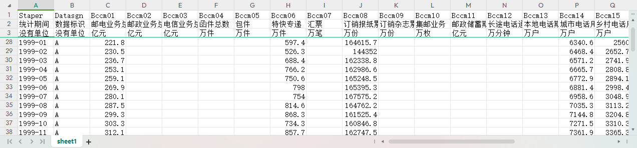 统计期间 数据标识 邮电业务总量 邮政业务总量 电信业务总量 函件总数 包件 特快专递 汇票 订销报纸累计数 订销杂志累计数 集邮业务 邮政储蓄期末余额 长途电话通话时长 本地电话期末用户数 城市电话用户数 乡村电话用户数 无线寻呼用户数 移动电话用户数 本地网内区间电话通话量 本地网内区内电话通话量 本地网内拨号上网通话量 固定本地电话通话时长 移动电话通话时长 城市住宅电话年末用户数 农村住宅电话年末用户数 3G移动电话用户数 移动短信业务量 互联网宽带接入用户