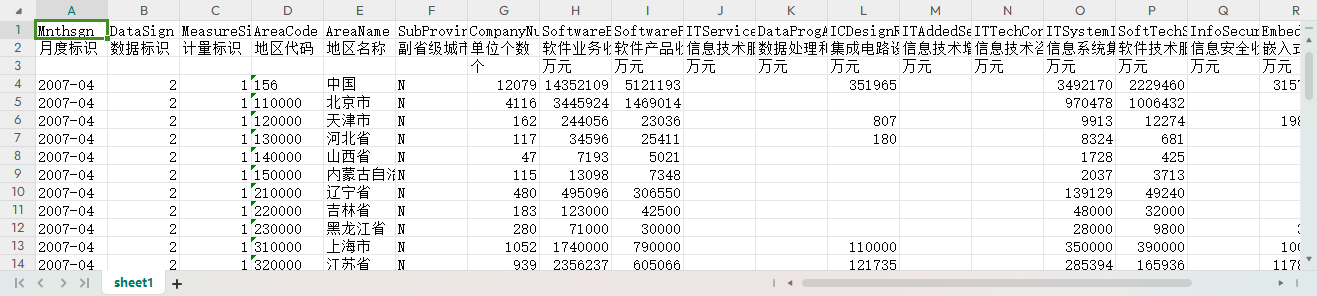 月度标识 数据标识 计量标识 地区代码 地区名称 副省级城市标识 单位个数 软件业务收入合计 软件产品收入 信息技术服务收入 数据处理和运营服务收入 集成电路设计收入 信息技术增值服务收入 信息技术咨询服务收入 信息系统集成和支持服务收入 软件技术服务收入 信息安全收入 嵌入式系统软件收入 设计开发收入 利润总额